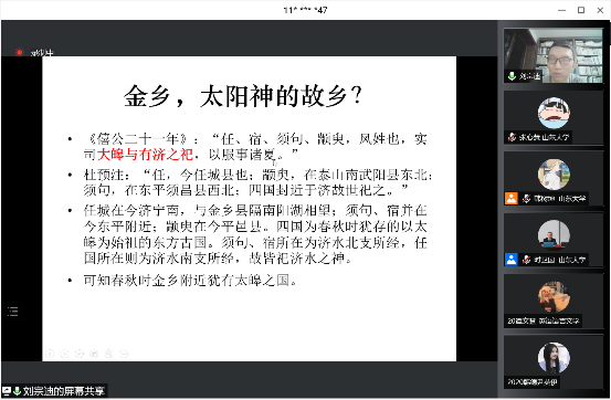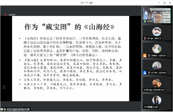 接下来,刘教授带领在线师生根据《山海经》“寻宝”。他认为《大荒经》四面环海的地理格局与历史上的山东半岛十分相似,可将山东半岛视为《山海经》的地域范围。他还详细论证《大荒西经》中记载的巫山、大巫山两处金山位于山东省济宁市金乡县和鱼台县一带。并指出:当时黄金象征着“不朽、通神、太阳”,所以在上古时期,主要被巫师集团所拥有。结合《山海经》的记载,可以得出该处矿藏并非自然形成而是巫师收集埋藏所形成的结论。